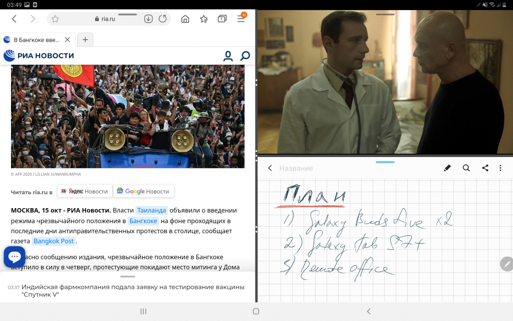 С такой функциональностью на большом экране Samsung Galaxy Tab S7+ можно делать несколько дел одновременно — например, читать новости, смотреть сериал и что-то записывать.