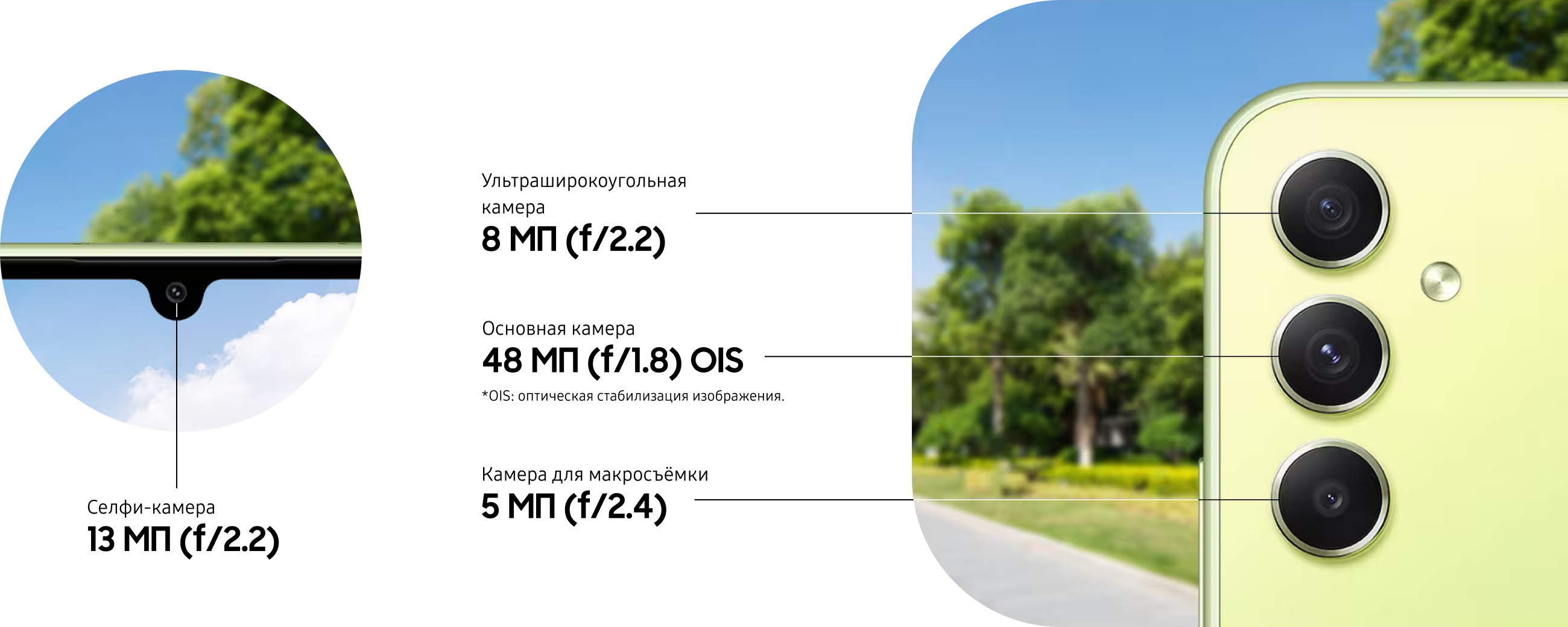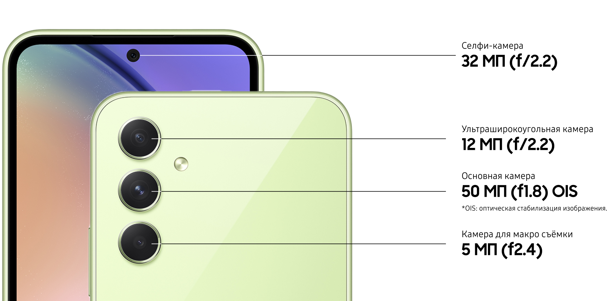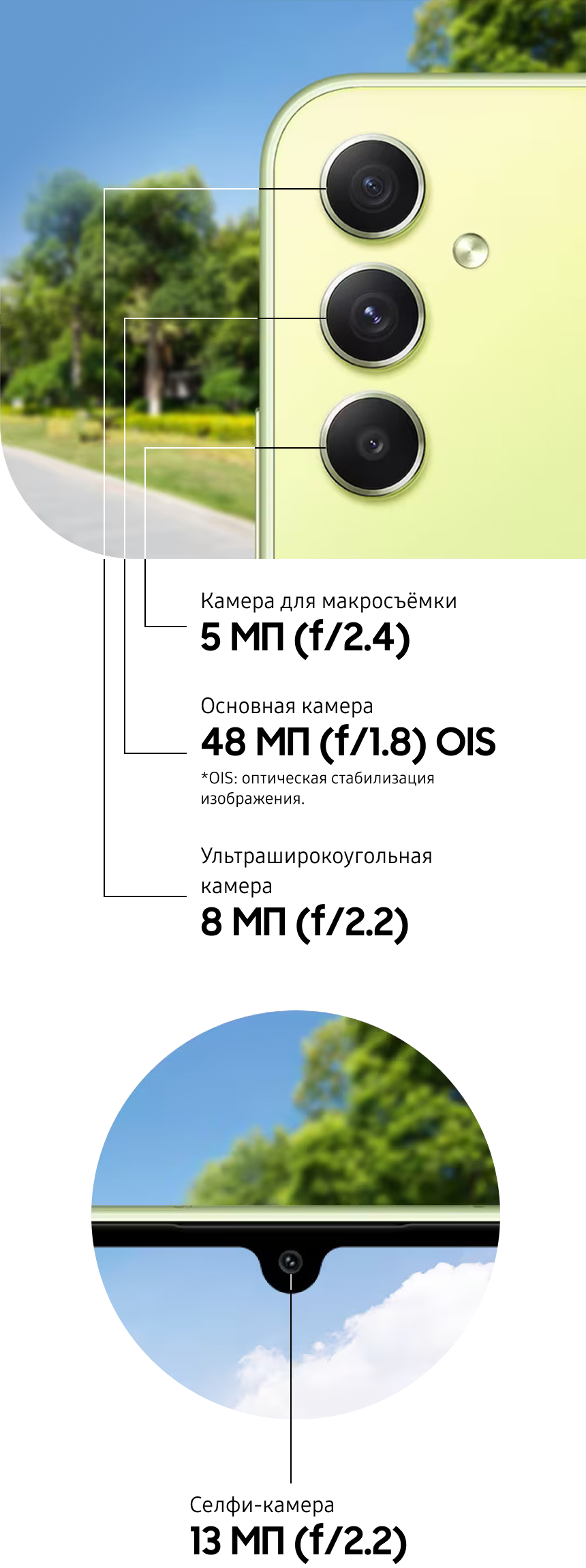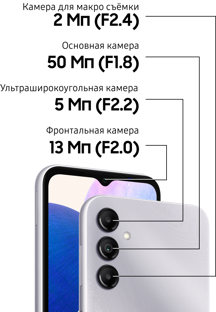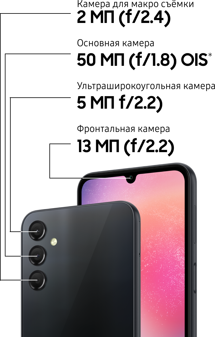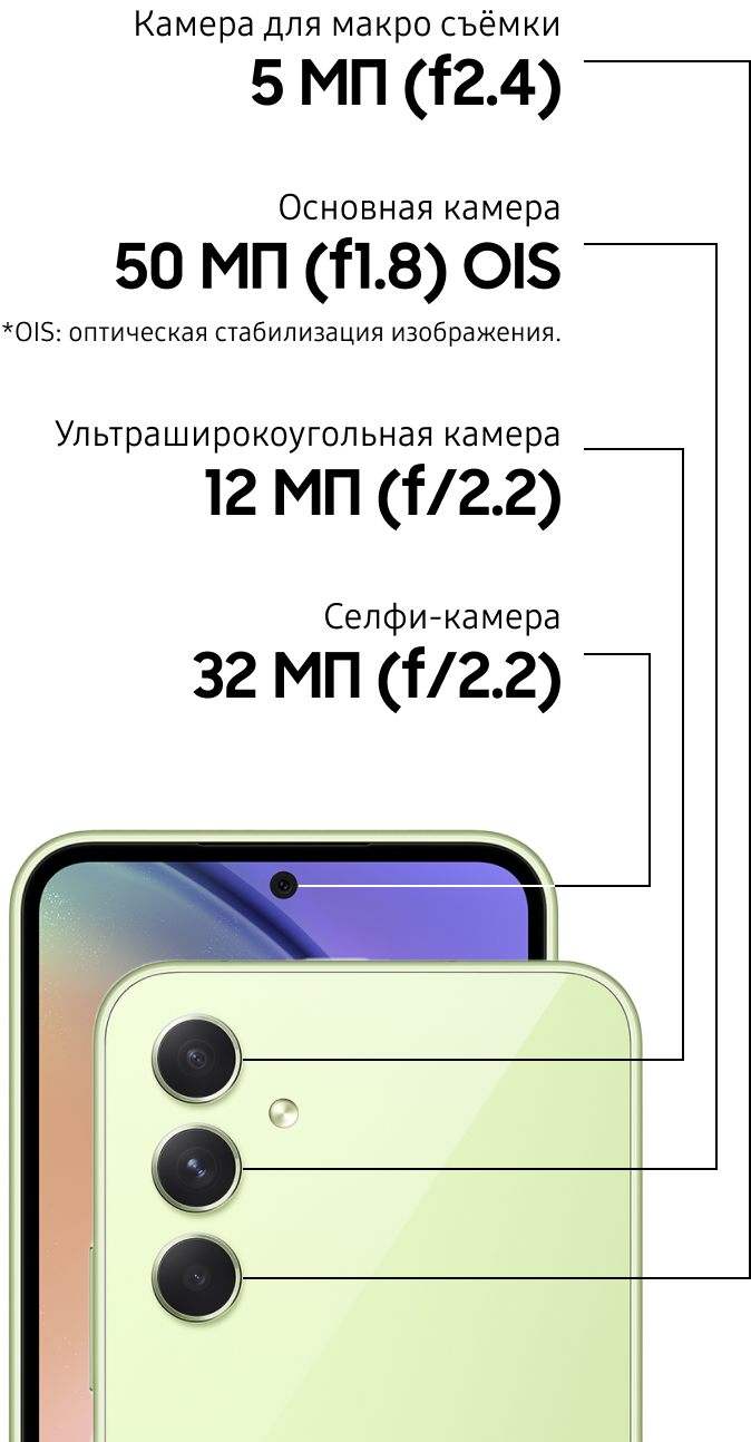** Фактический рабочий ресурс аккумулятора может зависеть от сетевого окружения, особенностей использования и других факторов. Оценка произведена на основе среднестатистического профиля использования, составленного Strategy Analytics. Независимая оценка Strategy Analytics была произведена в период с 2023.01.19 по 01.30 в Великобритании с использованием предварительных версий SM-A346 с настройками по умолчанию в сети 5G Sub6, LTE и Wi-Fi.