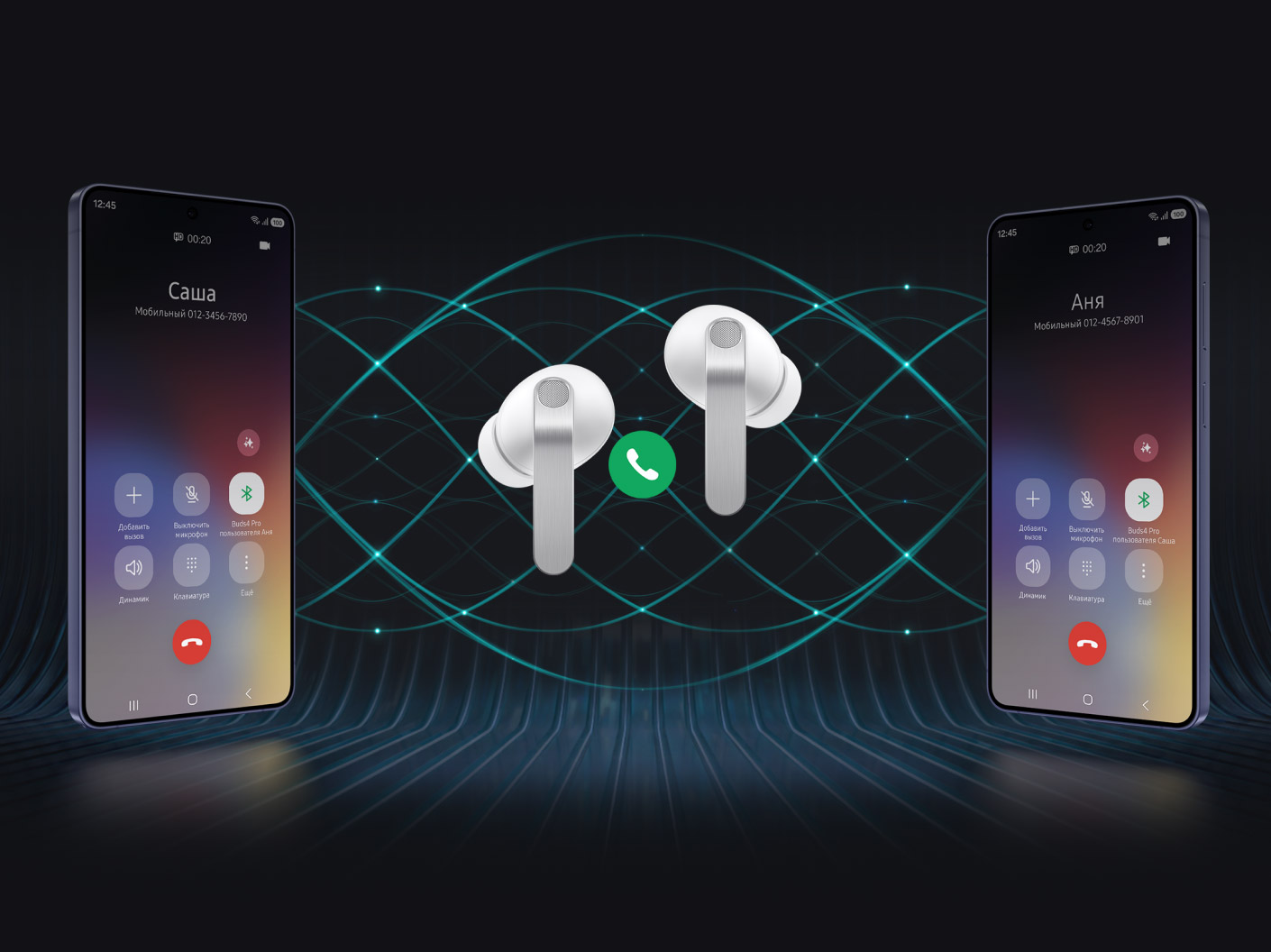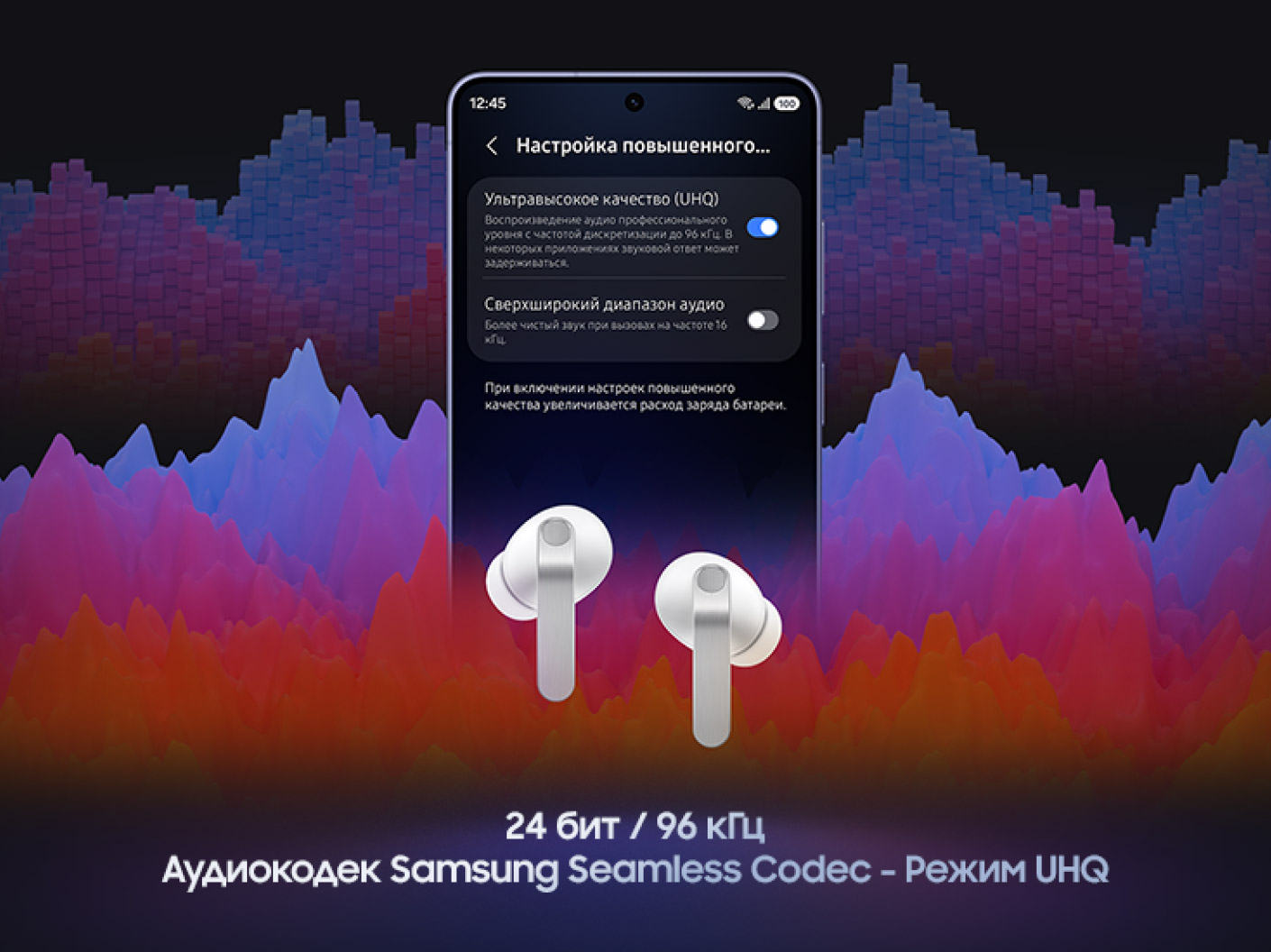 Благодаря расширенному динамическому диапазону и высокой частоте дискретизации музыка оживает во всех деталях. Аудиокодек SSC (Samsung Seamless Codec) воспроизводит звук с максимальной частотой дискретизации 96 кГц и разрядностью до 24 бит, сохраняя оригинальное звучание без потери качества. Оптимизированное управление передачей данных обеспечивает стабильное прослушивание с минимальными искажениями и без прерываний. А режим Ультравысокое качество (Ultra High Quality Audio), который можно активировать на смартфоне Galaxy, позволяет заново открыть для себя любимые треки во всем их великолепии.2,3,4