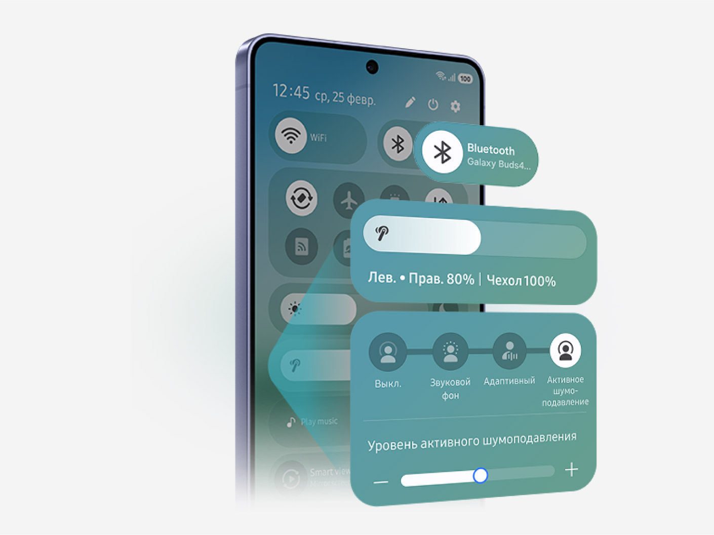 Улучшенный интерфейс One UI 8.5 обеспечивает бесшовное взаимодействие между вашими Galaxy Buds и смартфоном Galaxy, которые начинают работать словно в тандеме. Управление стало понятным, как никогда: активируйте нужные функции в настройках, не загружая отдельные приложения. А с помощью панели Быстрого доступа вы сможете легко получить доступ к функциям и сохранить настройки звука для каждого отдельного приложения.1,13,14
