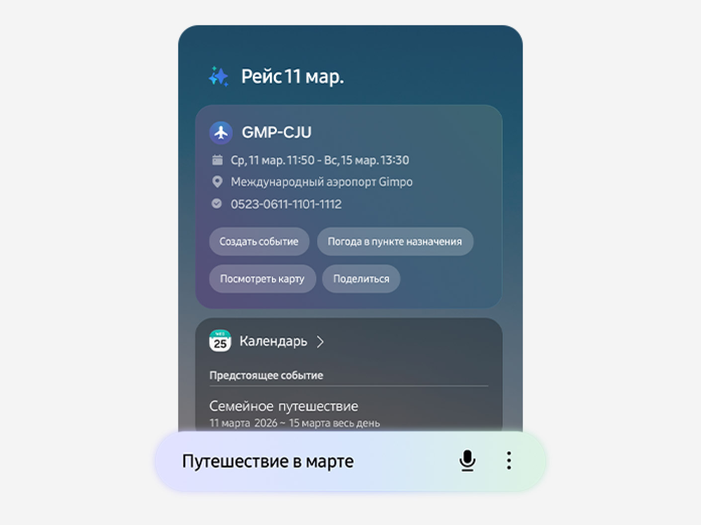 Доступные функции и возможности поиска с Finder могут различаться в зависимости от страны, региона и языка. Для расширенного поиска данные можно искать только на языке текущих системных настроек. В настоящее время поддерживаются следующие приложения: Календарь, Напоминания, Заметки, Запись звонков, Звукозапись, Мои файлы, Галерея и Настройки. Для использования полученных данных необходимо включить уведомления. Доступ к данным, полученным из уведомлений поддерживаемых приложений, Сообщения, Gmail и Samsung Wallet, при этом доступ к данным, собранным из Gmail, возможен только в том случае, если пользователь дает согласие на то, чтобы Personal Data Intelligent считывал данные Gmail. Данные о бронировании доступны только из сообщений с подтверждением бронирования.18