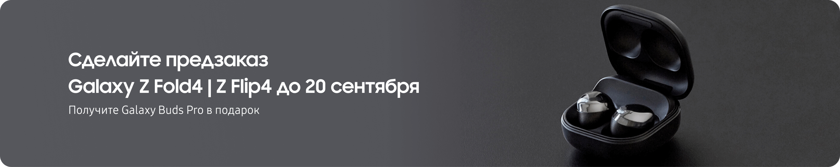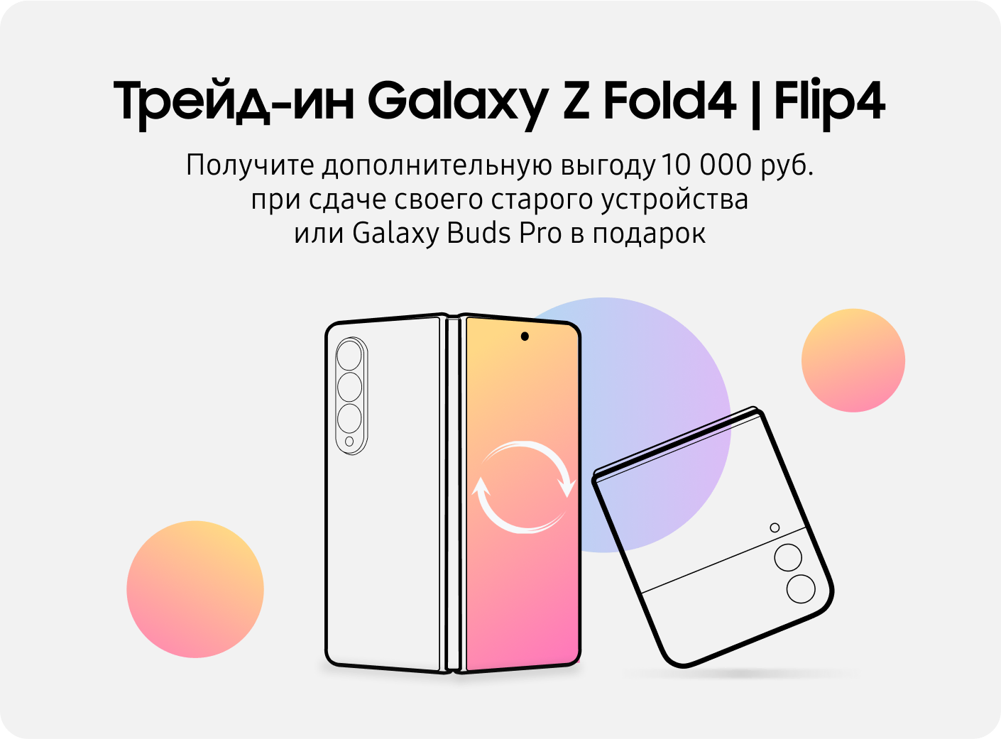 *Акции «Оформи предварительный заказ на Samsung Galaxy Z Flip4 | Z Fold4 и получи в подарок Galaxy Buds Pro» и «Оформите предзаказ на Samsung Galaxy Z Flip4 | Galaxy Z Fold4 и получите дополнительную выгоду 10 000 руб. в трейд-ин» действуют с 26 августа по 20 сентября 2022г. Акции не суммируются друг с другом и с другими акциями и специальными предложениями.
